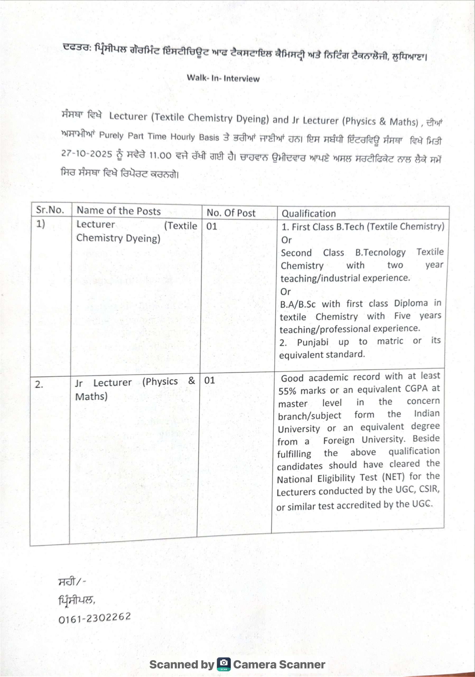 ਸੰਸਥਾ ਵਿਖੇ Lecturer (Textile Chemistry Dyeing) and Jr Lecturer (Physics & Maths), ਦੀਆਂ ਅਸਾਮੀਆਂ Purely Part Time Hourly Basis ਤੇ ਭਰੀਆਂ ਜਾਣੀਆਂ ਹਨ। ਇਸ ਸਬੰਧੀ ਇੰਟਰਵਿਊ ਸੰਸਥਾ ਵਿਖੇ ਮਿਤੀ 27-10-2025 ਨੂੰ ਸਵੇਰੇ 11.00 ਵਜੇ ਰੱਖੀ ਗਈ ਹੈ। ਚਾਹਵਾਨ ਉਮੀਦਵਾਰ ਆਪਣੇ ਅਸਲ ਸਰਟੀਫਿਕੇਟ ਨਾਲ ਲੈਕੇ ਸਮੇਂ ਸਿਰ ਸੰਸਥਾ ਵਿਖੇ ਰਿਪੋਰਟ ਕਰਨਗੇ।